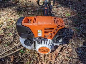 A small orange and black electric chainsaw with a yellow and black safety sticker on the side is lying on the ground surrounded by fallen leaves and branches. | Stihl FS91R. One month old for Sale in Portsmouth, VA | 5f1b08e0e84d9caa96176093e7ea62a712a3e66385b5ac40c5b42f284ed39055 | 000720938662 | 0 | 0 | 28 | 10 | 0 | 0 | |