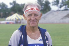 A man with white hair is wearing a white headband with the words 'Run All Day' written on it. He has a white shirt with a blue jacket over it, and he is standing on a grassy field. In the background, there are tents and a stadium. | A runner at the Senior Olympics, Stock Images | 5cc4659a3ba1579a4de03aaec264dfed3237da560319b2702263e972b808b350 | 000720938682 | 0 | 0 | 47 | 8 | 0 | 0 | |