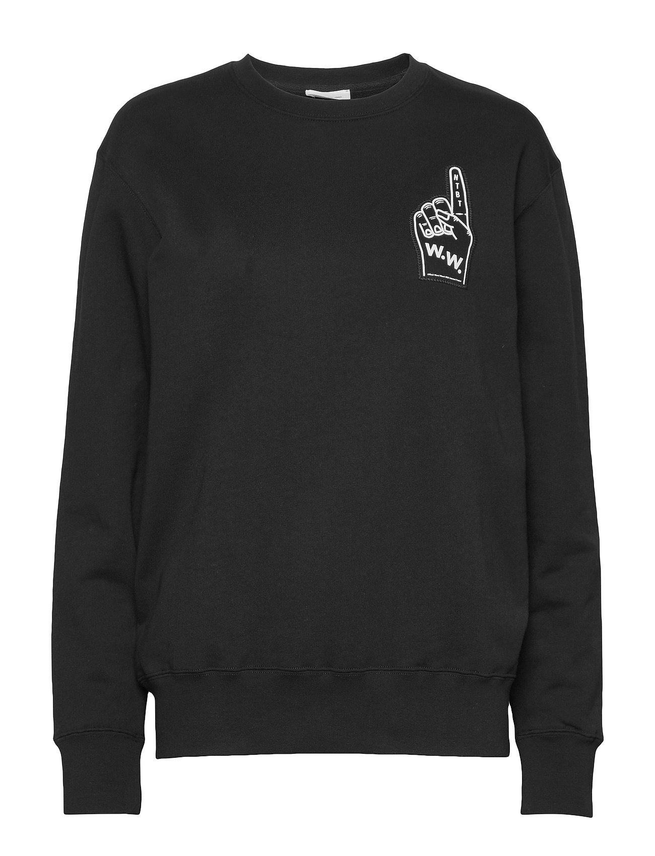 A black sweatshirt with a graphic print on the front, featuring a hand with a peace sign and the text 'WMC' in white. The sweatshirt has a ribbed collar, cuffs, and hem, and is shown against a white background. | Wood Wood Hugh sweatshirt - BLACK | fc2e03900becada894b289070fa1723a1c13f9773c7cb19d20ffcf50cdced8f7 | 000720939590 | 0 | 0 | 39 | 6 | 0 | 0 | |