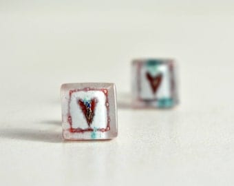 Two small, square-shaped, colorful beads with a heart design are placed side by side on a white surface. The beads have a glossy finish and are positioned with their heart designs facing upwards. The first bead is predominantly white with red and blue accents, while the second bead is predominantly blue with red and white accents. | Heart earrings, Glass and sterling silver, Love stud earrings, Romantic earrings, Handcrafted earrings, Fused glass jewelry | 7a07c42d80d485e14ffe93b8d7dd7058802484ec013bc55810ac48e50fbadf2d | 000720939662 | 0 | 0 | 56 | 16 | 0 | 0 | |