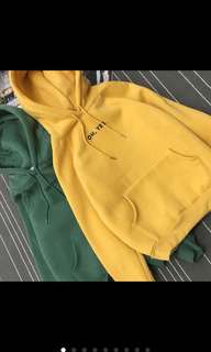A yellow hoodie with the word 'GALAXY' on the front is laid out on a surface with a striped pattern. The hoodie is positioned to the right of the frame, and there is a green hoodie to the left. The yellow hoodie is partially zipped up, and the green hoodie is fully zipped up. | Korean style hoodie | 201e724636a1367d1e41658b7aec169931539a6771436aed21649a7115127a83 | 000720939479 | 0 | 0 | 54 | 3 | 0 | 0 | |