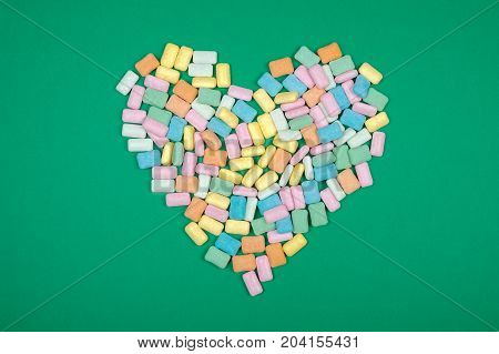 A collection of colorful candy pieces is arranged in a heart shape on a green background. The candies are in various shades of pink, yellow, blue, and green. The heart shape is symmetrical, with the candies forming a perfect heart shape. The background is a solid green color, and there is a white copyright symbol with the number 2420455311 and the word 'BIGGER' in the bottom right corner. | Brightly Colored Close Up Chewing Gum | e9fbe813ecd89fc722e1500ec9e6f04726d2f7d5bf1483fd609dbc78cb5de3fb | 000720939562 | 0 | 0 | 68 | 6 | 0 | 0 | |