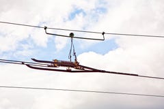 A close-up view of a power line with a metal hook attached to it. The hook is hanging from the line, and the background features a blue sky with scattered clouds. | Railway wire of the high tension line Royalty Free Stock Images | 1f35402fc4563e2e9c179d607143a884ef69635a8ba4d9b535695cc4860eb441 | 000720939652 | 0 | 0 | 31 | 11 | 0 | 0 | |