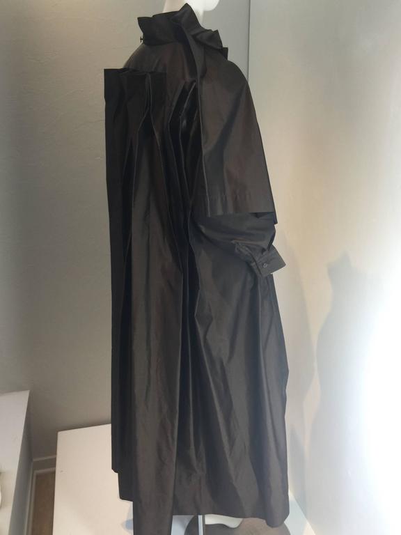 A black raincoat is displayed on a mannequin against a white wall. The mannequin is positioned on a white floor, and the coat is draped over the mannequin's shoulders, with the hood partially covering the head. The coat appears to be made of a waterproof material, and the mannequin is not visible, only the coat is shown. | Issey Miyake Gown Late 1980's In Excellent Condition For Sale In Carmel by the Sea, CA | cb13451209b0d2c4d36f20e2b18758dd6df15a69f79e110eb328a283f567dbcb | 000720940093 | 0 | 0 | 57 | 16 | 0 | 0 | |