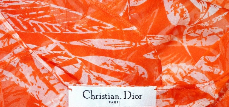 A close-up view of a vibrant orange fabric with a pattern of large green leaves. The fabric appears to be a Christian Dior piece, as indicated by the label attached to it. The label is white with black text, and the fabric has a glossy finish. | NEW Christian Dior Belted Chiffon Silk Printed Tunic Kaftan Dress For Sale 1 | f0df9312a7fa307dbff84589c6095223f80429db01d1e3804d7fe0c50b4c8f55 | 000720940100 | 0 | 0 | 46 | 13 | 0 | 0 | |