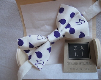 A polka-dotted bow tie with a white background and purple dots is displayed on a white cloth. The bow tie is tied in a bow shape and is accompanied by a tag with the brand name 'ZALI' and the phrase 'SECCAGRA ARTIGIANALE NOTO SCICIA TUMBA'. The tag is attached to the cloth with a string. | Screenprinted men's bowtie in vintage silk | 6b360e4714f8e01544ec0bb4ae1f129c8bb348ebb7d859e72f00c339f35069e4 | 000720939817 | 0 | 0 | 55 | 6 | 0 | 0 | |