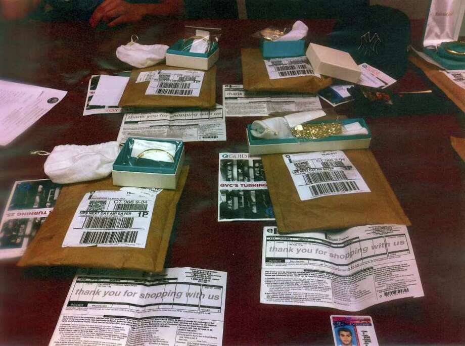 A table with various items including jewelry, gift boxes, and papers. There are two gift boxes with jewelry inside, one with a blue box and the other with a white box. There are also two brown paper bags with barcodes on them, and a piece of paper with a barcode and the text 'THANK YOU FOR SHOPPING WITH US'. Additionally, there is a piece of paper with a barcode and the text 'THANK YOU FOR SHOPPING WITH US' and a driver's license on the table. | This merchandise shipped by QVC was seized by Bridgeport police. The items were purchased with the use of stolen credit card numbes, police say. Photo: Ned Gerard / Connecticut Post | 8c0610f171a265b959a08d551dfce08596f6f6a7de5cb1bd4b6084228e897f7d | 000720940066 | 0 | 0 | 85 | 30 | 0 | 0 | |