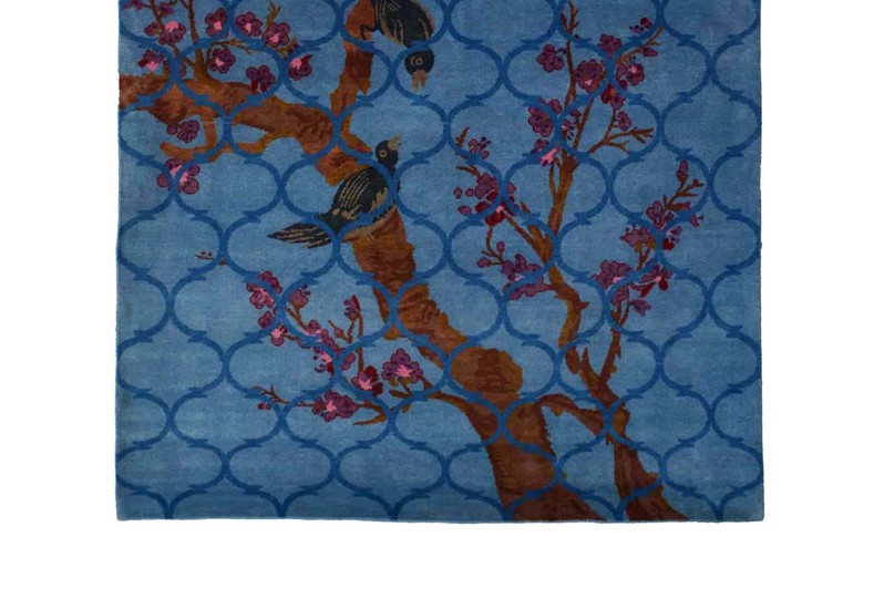 A blue rug with a pattern of a tree and birds, featuring a large tree trunk and branches with pink blossoms, and two birds perched on the branches. | Birds in heaven woolen carpet yak carpet treniq 3 | 4790422b2c64f048807a0482971713250fd83fa905016efce22ec1c35b6d7abb | 000720940075 | 0 | 0 | 28 | 9 | 0 | 0 | |