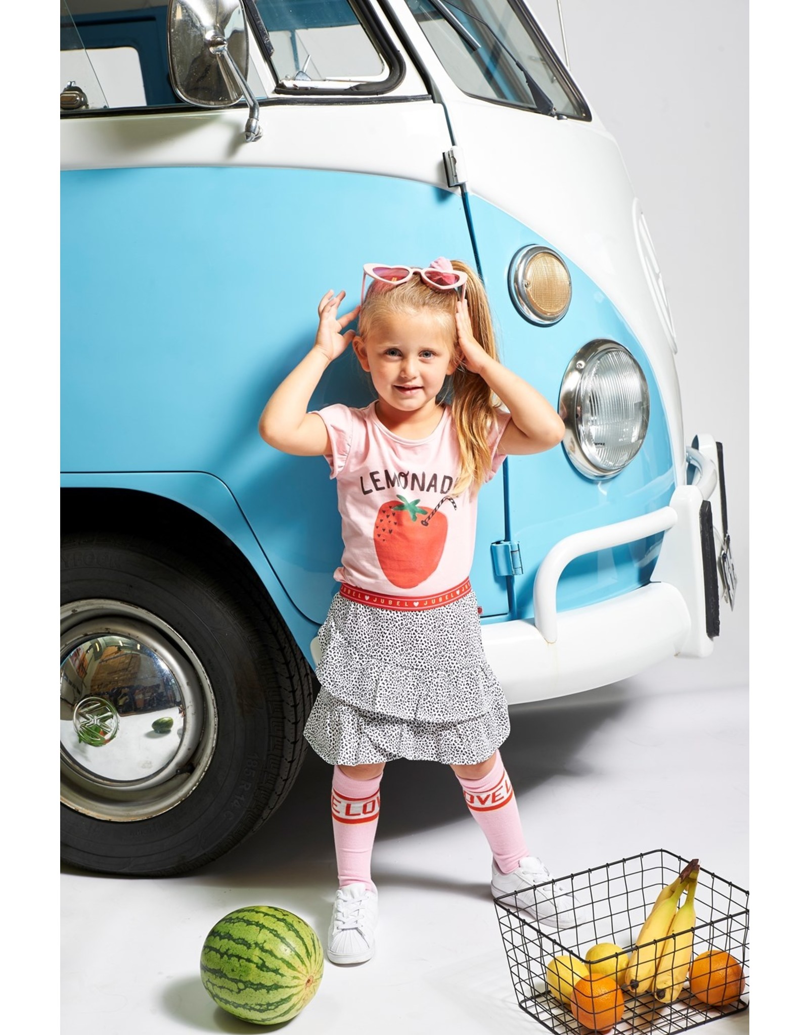 A young girl is standing in front of a blue and white vintage van. She is wearing a pink t-shirt with a lemon design, a grey skirt, and pink socks with white shoes. Her hair is styled in pigtails, and she is wearing red sunglasses. Next to her is a basket filled with bananas and oranges, and a whole watermelon is placed on the ground. | Jubel T-shirt Lemonade roze - Tutti Frutti | 39da2243e9f81fa21d2b06a7f2d061abe31d636c462944a7838fd95903c8a394 | 000720940213 | 0 | 0 | 65 | 7 | 0 | 0 | |