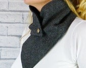A woman is wearing a white top with a grey scarf tied around her neck. | READY TO SHIP Women's Buttoned Scarf - Charcoal Herringbone Yorkshire Tweed | e82daf2dfdb582b50aabe43e8eb9e49c96d7e7b23d1fe5ce765e9ffe925f723f | 000720940337 | 0 | 0 | 15 | 11 | 0 | 0 | |