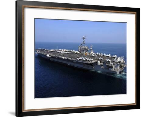 A framed picture of a large aircraft carrier with multiple fighter jets on its deck, floating on calm blue waters under a clear sky. The carrier is positioned in the center of the frame, with the jets lined up on the deck. The frame is black with a wooden border, and the picture is set against a white background. | The Nimitz-class Aircraft Carrier USS John C. Stennis-Stocktrek Images-Framed Art Print | f3ea8e67b55c088d46e7933449dc3cbda541b5c1389ce045faa7ce939d6ffa26 | 000720940296 | 0 | 0 | 59 | 11 | 0 | 0 | |