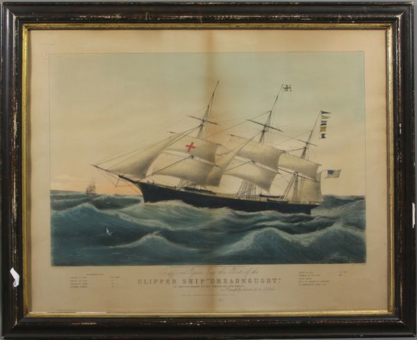 A vintage illustration of a sailing ship on the open sea, framed and mounted on a wall. The illustration is detailed, showing the ship's sails, rigging, and hull, as well as the waves and sea spray around it. The frame is ornate, with a dark border and a lighter inner frame, and the illustration is mounted on a wall with a visible nail at the top right corner. | 5259 N Currier Clipper Ship Dreadnaught Litho | 26668bec6850ec31d05dbaa253f7fafe387816b7e5481823de322dfc88e7b366 | 000720940310 | 0 | 0 | 68 | 7 | 0 | 0 | |
