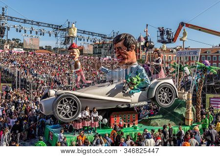 A vibrant parade scene with a large crowd of spectators. In the foreground, there is a float featuring a giant, detailed sculpture of a man's head and upper body, wearing a blue shirt and a green tie. The man's face is smiling, and he has glasses and a mustache. The float also includes a miniature car and a small figure of a man in a pink shirt and blue pants. The background shows a cityscape with buildings and a clear blue sky. | Nice, Cote D\xe2\x80\x99azur, France - February 24 2019: Carnaval De Nice, This Years Theme King Of Cinema (roi | c5552ae557b8ff376d3f0e8563607e4ddf164d8199d4137748b2af30693a39a8 | 000720940195 | 0 | 0 | 82 | 18 | 0 | 0 | |