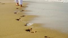 A person is walking on a sandy beach, leaving a trail of footprints behind them. The footprints are clearly visible in the sand, and the person is wearing white pants. The ocean is visible in the background with waves gently crashing onto the shore. | Man Walking on Beach Footsteps Covered by water HD - stock footage | 56994fd07a16dc27fc22a43311c2da7017d1a72cbafe1e34ef01c83a6796e9f7 | 000720942341 | 0 | 0 | 44 | 12 | 0 | 0 | |