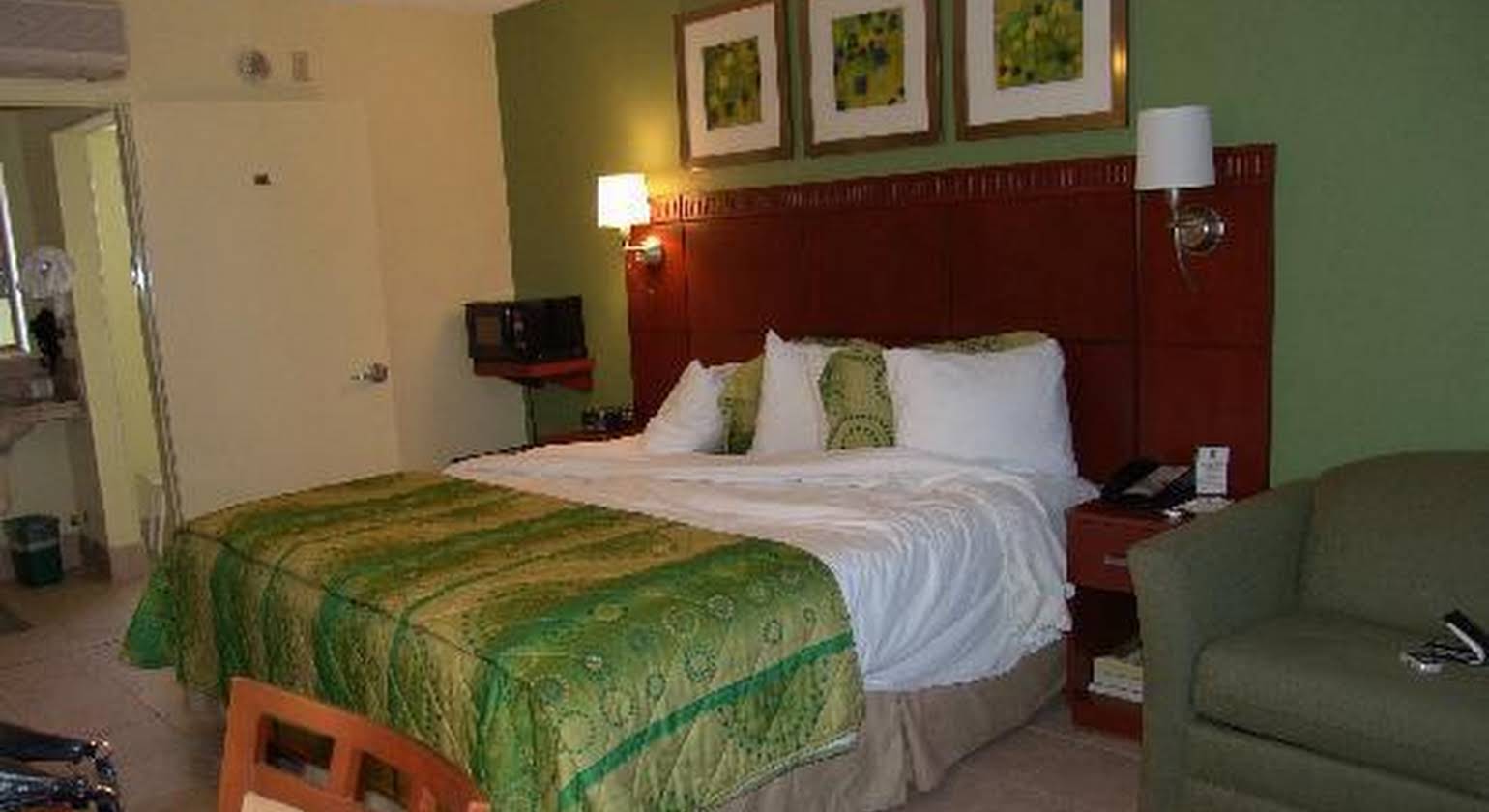 A hotel room with a large bed covered in a green and white patterned comforter. The bed has a wooden headboard and is adorned with multiple pillows. There are two framed pictures on the wall above the bed, and a lamp is mounted on the wall to the right of the bed. A chair is positioned to the right of the bed, and a small table with a phone and a remote control is next to it. The room has a green wall and a beige carpet. | Quality Inn & Suites Hollywood Boulevard | 648a414bfe0fb81a66bb4454f2b85070cb37faf9928c800768b4db3d0fcd5d43 | 000720942255 | 0 | 0 | 87 | 6 | 0 | 0 | |