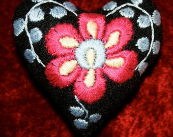 A heart-shaped embroidered patch with a red and yellow flower design in the center, surrounded by a black border with silver and blue accents. The patch is placed on a red velvet background. | Matyo Heart Embroidered Pincushion | d01c812d7c156b432ccef4120d52fc93fe591d89710821672202744e8dc747e2 | 000720942344 | 0 | 0 | 33 | 4 | 0 | 0 | |
