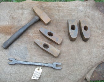 A collection of old, rusty tools is displayed on a leather mat. The tools include a hammer, a wrench, and several metal blocks with holes. A tag with a price is attached to one of the blocks. | Very rare set of 5 Saw Set hammers, straight, cross peins, Master Bladesmith tools | b79ce9ebd4c65de395aa8657699d727e1d38f5a57e5f608df4e4b1cf06216831 | 000720942303 | 0 | 0 | 37 | 14 | 0 | 0 | |