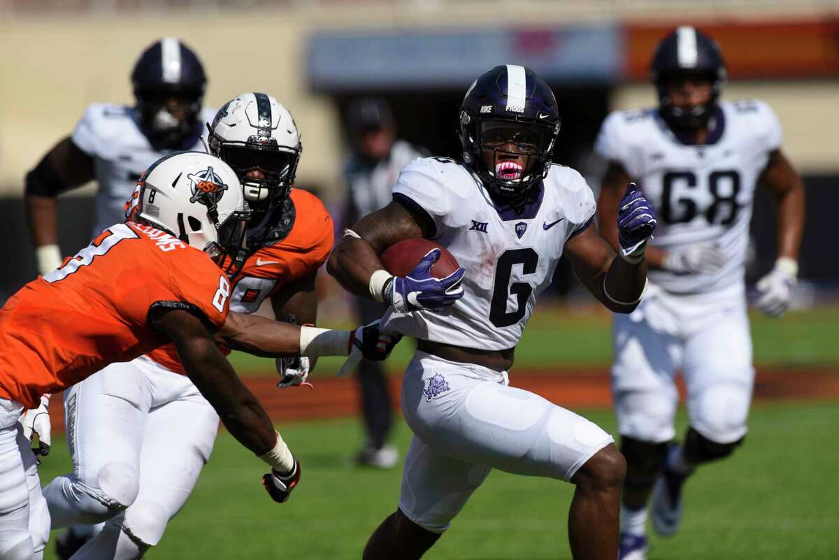 A football player in a white jersey with the number 6 is running with the ball, being chased by a player in an orange jersey with the number 8. The player in white is wearing a helmet with a purple facemask and is looking to the side. The player in orange is wearing a helmet with a white facemask and is also looking to the side. There are other players in the background, one in a white jersey with the number 68 and another in a white jersey with the number 8. | TCU running back Darius Anderson (6) runs from Oklahoma St defenders during an NCAA college football game between TCU and Oklahoma St in Stillwater, Okla., Saturday, Sept. 23, 2017.(AP Photo/Brody Schmidt) | 85cdd01ad07da25d7457512fc78d40c743605877118ab71115e90097399054b5 | 000720942367 | 0 | 0 | 92 | 31 | 0 | 0 | |