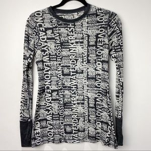 A black and white graphic t-shirt with a pattern of various words and phrases is displayed on a mannequin. The words are densely packed and cover the entire surface of the shirt, creating a visually busy design. The mannequin is positioned against a white background, which highlights the contrast between the black and white colors of the shirt and the background. | Lululmeon manifesto burnout long sleeve top | 8f4512f5a5e53b878282686fd4515fff6bb4d238a0af4d1252f2e415475ad434 | 000720942501 | 0 | 0 | 61 | 6 | 0 | 0 | |