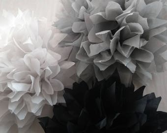 A collection of origami paper flowers in various colors and sizes is displayed on a white surface. The flowers are intricately folded and have a textured appearance. The colors include shades of white, gray, and black, with some flowers having a gradient effect. The arrangement is casual, with the flowers overlapping and placed at different angles, giving a sense of depth and dimension. | Pack of 10 pom poms / rustic wedding decorations / party decorations / birthdays / home decorations / marquee decorations / black tie dinner | c461b5d0bae0f854583de67e22ff835ed50eb962718950d5ad04513e3b31aad7 | 000720942539 | 0 | 0 | 63 | 24 | 0 | 0 | |