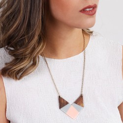 A woman with wavy hair is wearing a white top and a necklace with a geometric pendant. | Large Geometric Wooden Pendant Necklace in Pink and Grey | 50220c0c2ac1f38f1b62606932545020d39b9f07f363e382e22e10129bf60138 | 000720942408 | 0 | 0 | 17 | 9 | 0 | 0 | |