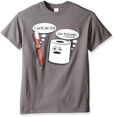 A grey t-shirt with a cartoonish design featuring a toilet with a face and a toothbrush with eyes and a mouth. The toilet is saying 'I hate my job' and the toothbrush is saying 'Oh please!'. The t-shirt is on a white background. | 34aca402e4 Amazon.com: T-Line Men's Funny Hate My Job Toothbrush Graphic T-Shirt: Clothing | fc721cce97fc4cdb20dead1b282f21bd28321c8a2fdac3c8adb6edc6ed2d8f0d | 000910697653 | 0 | 0 | 43 | 12 | 0 | 0 | |