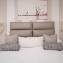 A neatly made bed with a white duvet and a large, textured grey pillow in the center. Two smaller grey pillows are placed on either side of the bed, and a large framed picture of a tree-lined river hangs on the wall above the bed. | Bedroom by Overberg Interiors | b856be3f3e3fa5c808efe9ca9949095ba9484234c494347843d16a86cdb4f42e | 000910697640 | 0 | 0 | 45 | 4 | 0 | 0 | |