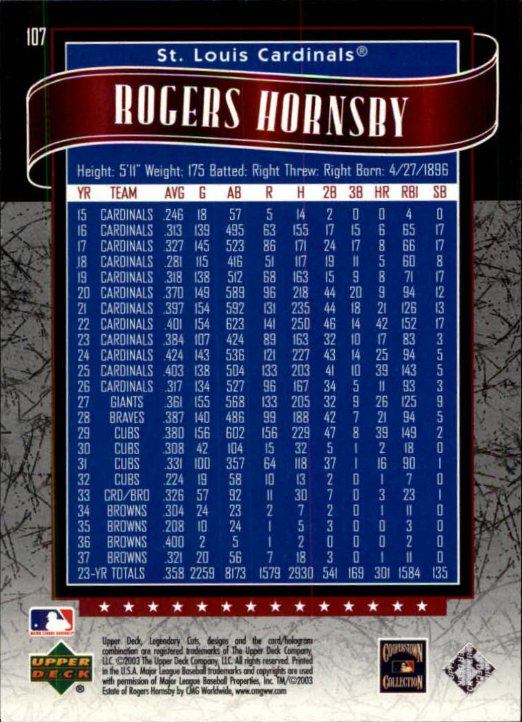A baseball card featuring a player named Rogers Hornsby with the St. Louis Cardinals. The card includes a batting average, height, weight, and other statistics. The card is part of a collection and has a number '107' in the top left corner. | 2003 SP Legendary Cuts #107 Rogers Hornsby back image | c467b281004e7d0c8087cd4825e9cfeda3b06b82a05b24d8ce969466744f7758 | 000910697569 | 0 | 0 | 42 | 9 | 0 | 0 | |