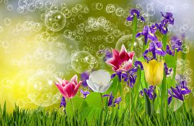 The second image shows the same scene with the flowers and grass, but the bubbles have been transformed into a more uniform, spherical shape, giving the impression of a different type of bubble. The color tone of the image is warmer, with a yellowish tint, and the overall effect is more dreamlike and less realistic than the first image. | Image Of Beautiful Flowers In Garden Close Up | 1934c2cbf30ec2dd74f350cd0a655cf79dffcaa67fe5b8128e0aef89dde307c9 | 000910697610 | 0 | 0 | 59 | 8 | 0 | 0 | |