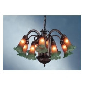 A vintage-style chandelier with a dark metal frame and multiple glass shades hangs from a ceiling. The shades are a combination of clear and frosted glass, with some featuring a greenish tint. The chandelier has a classic design with a central cluster of lights and several smaller lights branching out from it. The overall color tone of the image is cool, with a blueish hue dominating the scene. | Meyda Tiffany 15997 12 Lt Hanging Lily Amber/Green | b466fa8b6bd92bce607cfae122f6dbf2dd11401abc1f23234ba322c4b259d30d | 000910697947 | 0 | 0 | 68 | 8 | 0 | 0 | |