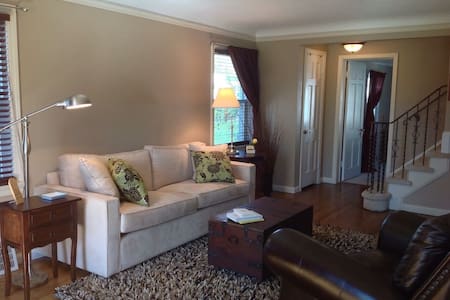 A cozy living room with a beige sofa adorned with green and white patterned pillows, a wooden coffee table with a book on top, a brown leather armchair, a wooden side table with a lamp, and a beige area rug. The room has a warm ambiance with a beige wall and a wooden floor. A white door is visible in the background, and a staircase with a red carpet is partially seen to the right. | Cute Cape Cod near Clinics and Colleges - South Euclid | 1ef0491a4636f8a66d561bbc9fe3290da8afa62bb65766eca6c77aa288b6f98f | 000910698174 | 0 | 0 | 75 | 10 | 0 | 0 | |