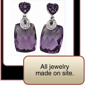 A pair of earrings with purple gemstones and silver accents are displayed against a white background. The earrings have a heart-shaped design with a large purple gemstone at the center, surrounded by smaller purple gemstones. The silver accents include a circular design with a smaller purple gemstone at the center, and a textured band that wraps around the top of the earring. The earrings are connected to a silver earring back. Below the image, there is a text box with the phrase 'All Jewelry Made on Site.' | Mens Jewelry - Colleyville, TX - Luxor Custom Jewelers - All jewelry made on site. | 3871a6bcc07f841e92e2af6f9b13b80137d3ba19bb75db9d671d39cacf8b0da4 | 000910698144 | 0 | 0 | 87 | 15 | 0 | 0 | |