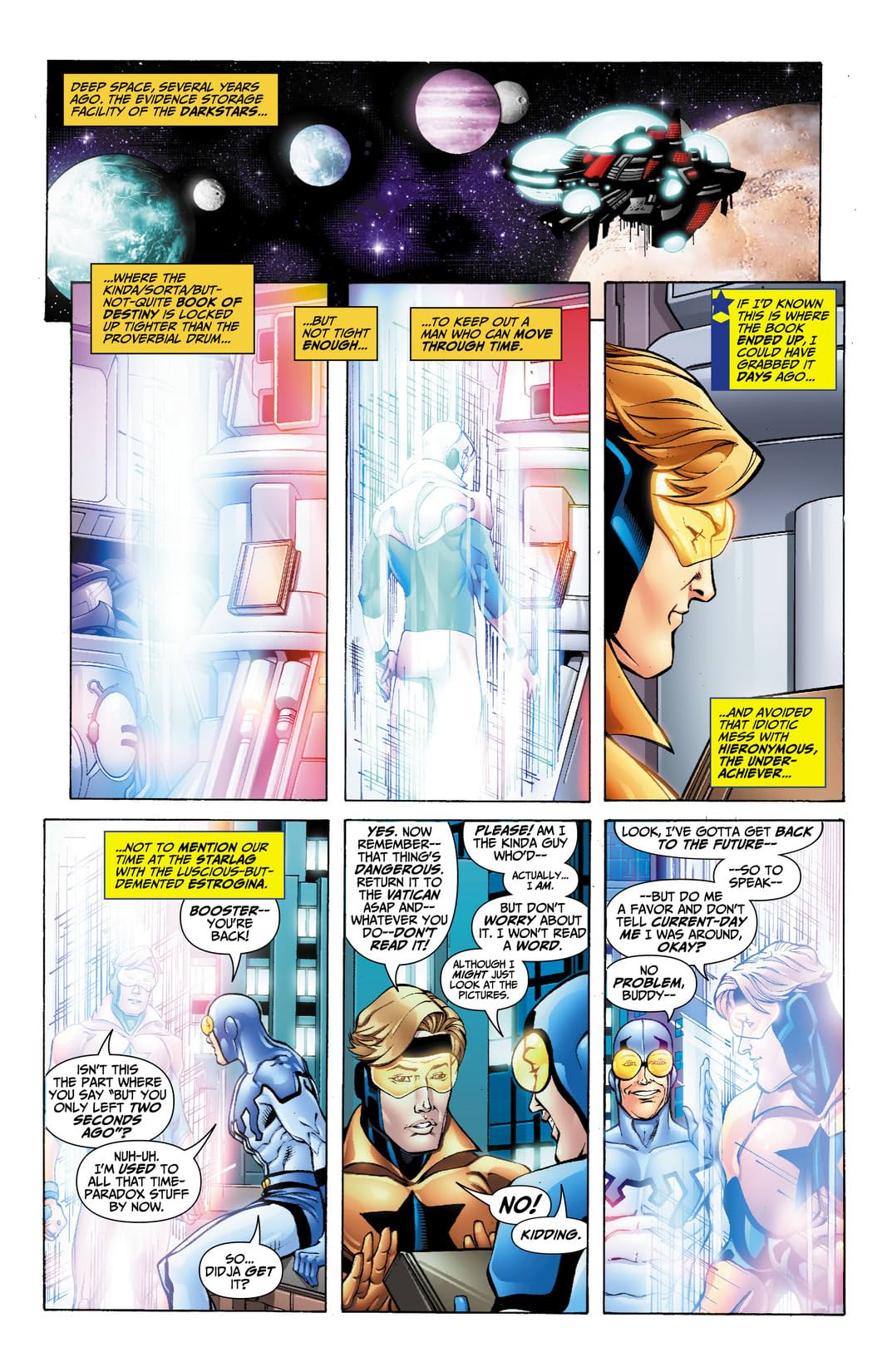 A comic book page with a space theme, featuring a character in a blue and white suit with a helmet and a cape, standing in front of a glowing portal. The background shows a space scene with planets, a spaceship, and a starry sky. There are speech bubbles with text, and the page is divided into panels with various illustrations and text. | Booster Gold (2007-2011) #38 | b440788671a8be3f8d24eef4858382942ba8526f744febf1bc2a8fac06ef1a0f | 000910698079 | 0 | 0 | 62 | 4 | 0 | 0 | |