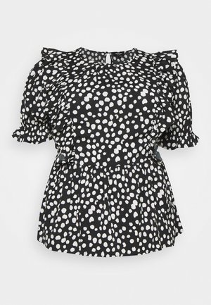 A black and white polka dot blouse with a ruffled collar and button details is displayed against a white background. | FRILL PEPLUM - Blusa - black | 5b95b0c0af1ec86572e9ae242ae0f4f703b133ff025530762bfa8336e228c03c | 000910698046 | 0 | 0 | 20 | 6 | 0 | 0 | |