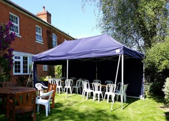 A blue tent is set up in a backyard with white plastic chairs and a wooden table inside. The tent is surrounded by green grass, and there are trees and a house in the background. | Mini Marquee Hire Fareham | 66a0df6d199b6f61bcbfb25ff89320efefe4522db7b49acfbeb61f5ccd2cde60 | 000910698026 | 0 | 0 | 35 | 4 | 0 | 0 | |