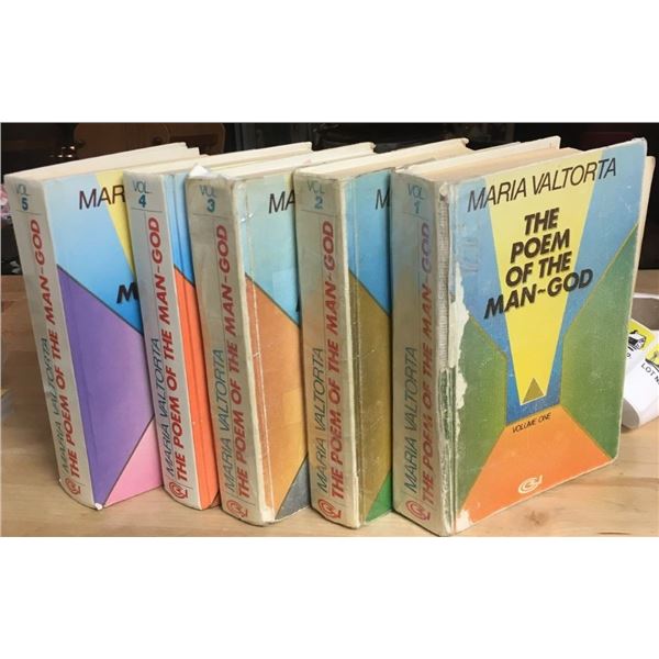 A collection of six books by Maria Valtorta is displayed on a wooden surface. The books are arranged in two rows, with three books in each row. The books have a uniform size and are bound in a light color with a darker spine. The titles of the books are visible on the spines, and they are in a foreign language, possibly Italian. The books are in good condition, with no visible damage or wear. | The Poem of the Man-God, ALL FIVE VOLUMES written by Maria Valtorta. | f7f96e1e39b4575aa1ea084e183590629acfec075e48920c54f3277dd7aeee7e | 000910699088 | 0 | 0 | 75 | 12 | 0 | 0 | |