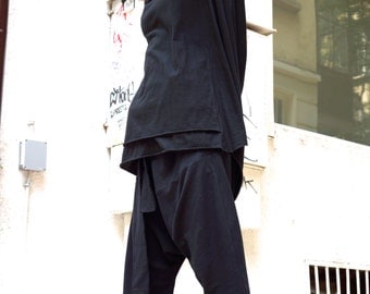 A person in a black shirt and pants is standing with their arms raised above their head, with their back to the camera. They are positioned in front of a wall with graffiti and a window, and there is a building to the right. | Loose Casual Black Drop Crotch Harem 7/8 Pants / Extravagant Black Pants/Unisex Cotton Pants A05135 | dbcd581a9ebf28cbf55a7ebe6a5951d486544565d744940e5755d0943d54303f | 000910698870 | 0 | 0 | 44 | 15 | 0 | 0 | |