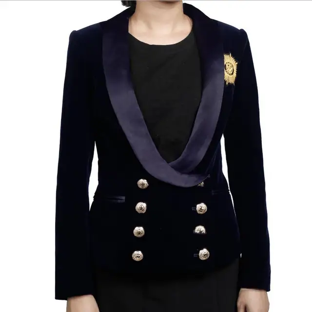 A woman is wearing a black turtleneck sweater and a navy blue blazer with gold buttons and a lapel. | Double breatsed metal buckle Europe station new corduroy velvet blazer 2017 female ladies short coat badge pattern BLAZER w1296 | 8a8a1ec7dba675e385ad3115ca7bd3f712f864ee0623c9612c801fc24c3aa35b | 001065732212 | 0 | 0 | 19 | 19 | 0 | 0 | |