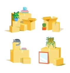 The second image shows the same set of four cardboard boxes, but with different items inside each box. The top left box now contains a potted plant, a stack of books, and a cup. The top right box has a cactus in a pot and a small potted plant. The bottom left box has a cat sitting on top of a stack of books, and the bo... | Cardboard Boxes for Moving Set vector image vector image | 87d24c48e2e344c486bfefd28c3ca1e6cfb4db186675632164de3cea5a7195aa | 001065732282 | 0 | 0 | 85 | 9 | 0 | 0 | |