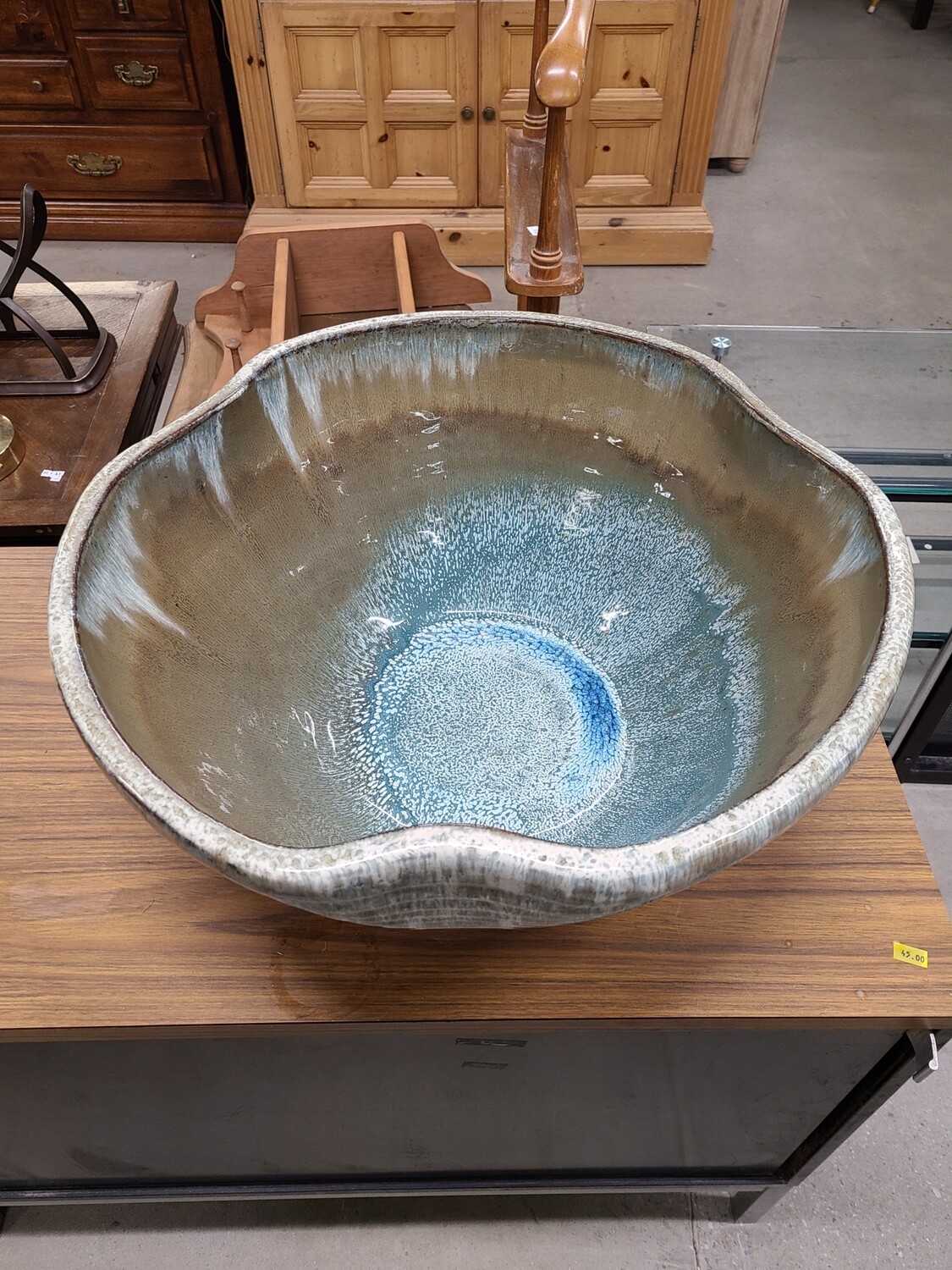 A blue and white ceramic bowl with a textured surface is placed on a wooden table. The bowl has a unique shape with a curved lip and a circular depression in the center. The table is situated in a room with wooden cabinets and a glass table in the background. | Large Bowl | e0e73a9482b97e37ac8ce6971b95e46a93851f0ce8c64e8d565b8c6b65558b2a | 001065732160 | 0 | 0 | 50 | 2 | 0 | 0 | |