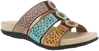 A pair of sandals with a beige upper and a blue lower section, featuring a perforated design and a circular buckle on the ankle strap. | Spring Step L'Artiste by Leather Slide Sandals- Glennie | c4ca4bb4b1b39fdc3b65ca715ecc938d281fca88c68168caafaac25cb6e5ddee | 001065732239 | 0 | 0 | 25 | 8 | 0 | 0 | |