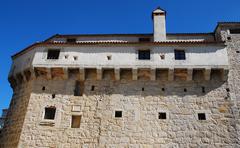 A medieval stone castle with a conical roof and a tall chimney stands against a clear blue sky. The castle has multiple windows and a stone wall with a wooden door. The architecture features a combination of stone and brickwork, with a prominent arched window on the upper level. | Pazin Castle - stock photo | ba6161a638f36af2ce1388b7a1dc25270d0a9461c14392fe78505ad9aa38d2ab | 001065732308 | 0 | 0 | 49 | 5 | 0 | 0 | |