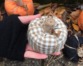 A person's hand is holding a small, burlap-wrapped pumpkin with a checkered pattern. The pumpkin is tied with a brown string and is surrounded by fallen leaves on a surface. | Sustainable Organic Pumpkins for Autumn Fall Season Recycled Fabric Filled with Fabric Pieces | 303fb95c7c2d462ab02941dbce576405a42c56f6a4ae1c99e4d32236eceb27ed | 001065732350 | 0 | 0 | 30 | 13 | 0 | 0 | |