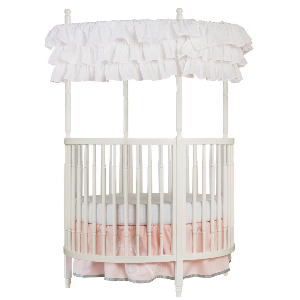 A white wooden crib with a white ruffled canopy is displayed against a white background. The crib has a pink and white striped skirt and is adorned with a white and pink ruffled blanket. | Sophia Posh White Circular Crib | 22c94989b4355297aeb701e710a3501ae1aa77d3c2c8c82ffa39f192f7c0dd46 | 001065732397 | 0 | 0 | 34 | 5 | 0 | 0 | |