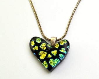 A black heart-shaped pendant with a colorful, iridescent pattern resembling a butterfly's wings is suspended from a gold chain. The pendant is set against a white background. | Dichroic Heart Pendant Green Gold Hearts on Black Glass Necklace | 755c782b4626f55add469ee12db0e96698af5f0a914f7ff929412520e20fb870 | 001065732349 | 0 | 0 | 27 | 10 | 0 | 0 | |