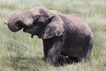 A young elephant is standing in a grassy field with its trunk curled up. | Elephant Drinking | 89adab6698685feffe58fa1890241362e4ef5262db0bae41db92f067187e4270 | 001065732346 | 0 | 0 | 14 | 2 | 0 | 0 | |