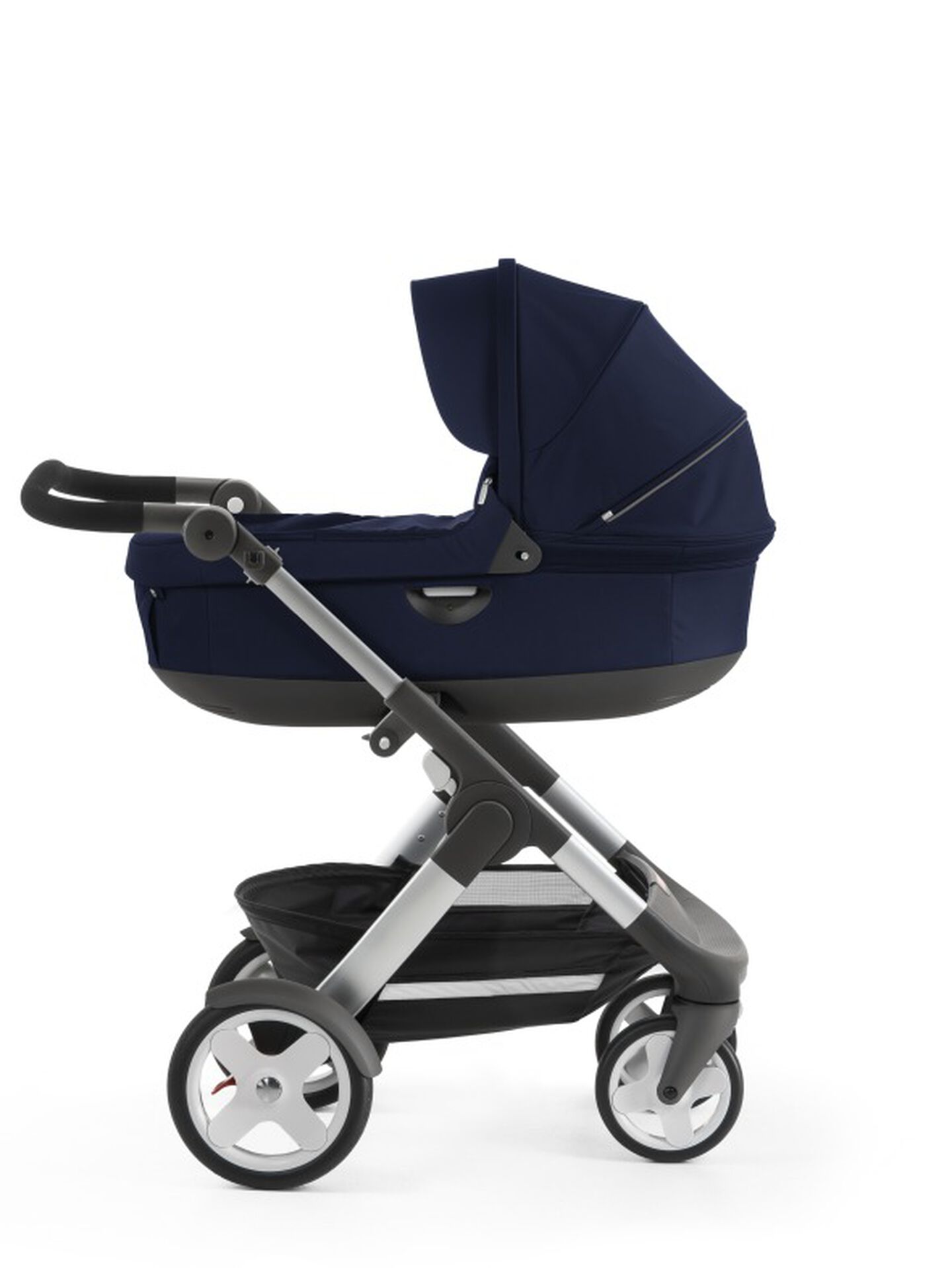 A modern stroller with a sleek design, featuring a black and grey color scheme, a large canopy, and a compact foldable frame. | Stokke\xc2\xae Trailz\xe2\x84\xa2 with Stokke\xc2\xae Stroller Carry Cot, Deep Blue. Classic Wheels. view 2 | d09a369e4fc869bda551223fff5947491b4274072453195bfe2af14da9682b87 | 001065732327 | 0 | 0 | 22 | 13 | 0 | 0 | |