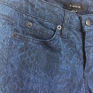A pair of blue jeans with a patterned fabric on the right leg, featuring a snake-like texture and a tag with the word 'BEBE' on the waistband. | Bebe Jeans With Lace Pattern | 8dbfc4d133b06e0a749942f58701897b31e2088c1ae5ffc5e2fd265e757494c8 | 001065732400 | 0 | 0 | 27 | 5 | 0 | 0 | |