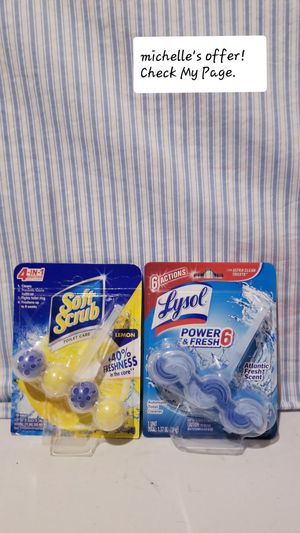 Two packs of cleaning supplies are displayed on a white surface. The left pack contains Soft Scrub, and the right pack contains Lysol Power & Fresh. Both packs are wrapped in plastic and have a blue and white striped background. A text box with the message 'Michelle's offer! Check my page.' is placed above the packs. | Soft scrub/Lysol toilet care set for Sale in Fort Washington, MD | 050b683ceac783935db9b4b2926072c0a1ffb465426548c4345f2fa5c632e3b7 | 001065732405 | 0 | 0 | 56 | 11 | 0 | 0 | |