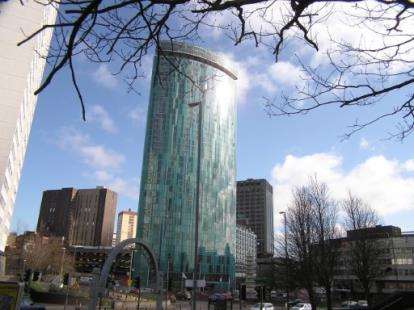 A modern glass skyscraper stands tall in a cityscape with a clear blue sky. The building has a reflective surface and is surrounded by other buildings. There are trees with bare branches in the foreground, and the street is visible with cars parked along the curb. | 2 Bedrooms Flat for sale in Holloway Circus Queensway, Birmingham, West Midlands | 60bba3a28ea29c8dd18e6c5a7468b00205600e16e63a65c24d6966b5536bb673 | 001065732484 | 0 | 0 | 46 | 12 | 0 | 0 |